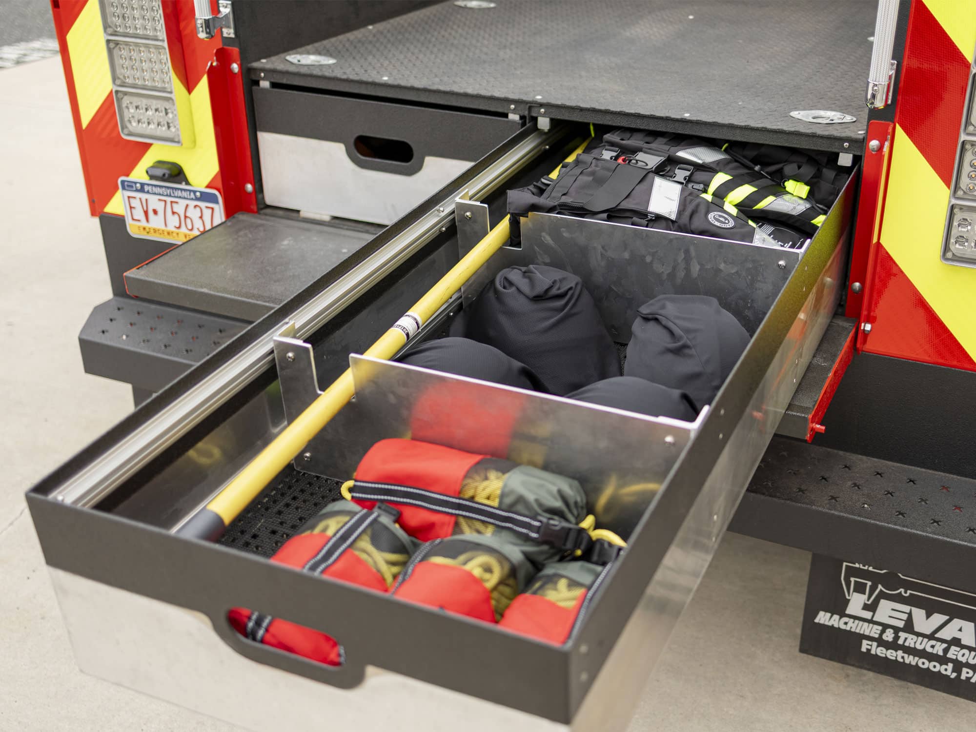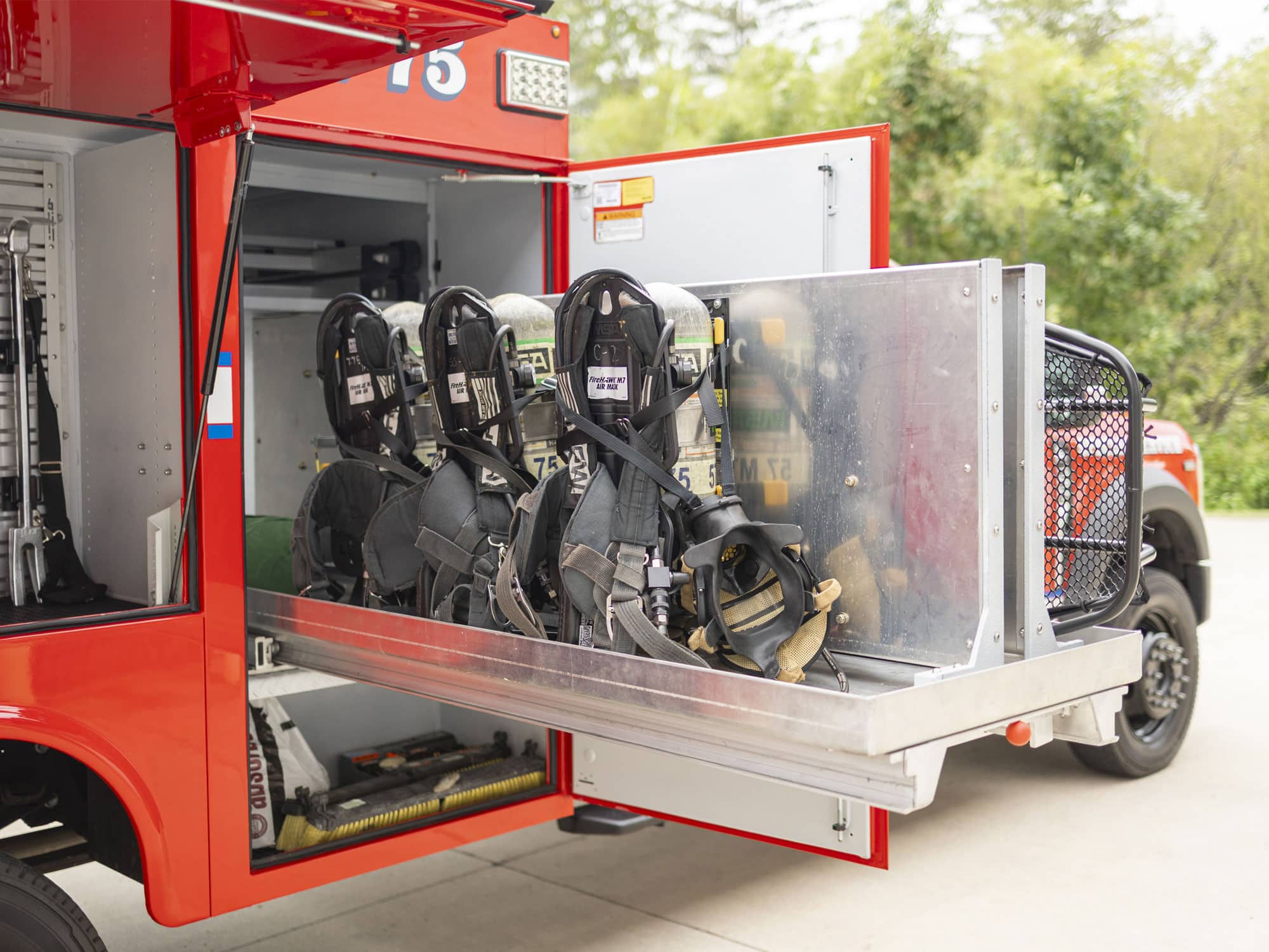 - Transverse compartments: A pull-out tray spans the width of the body, giving curb- and street-side access to a basket stretcher, breathing apparatus and pike poles