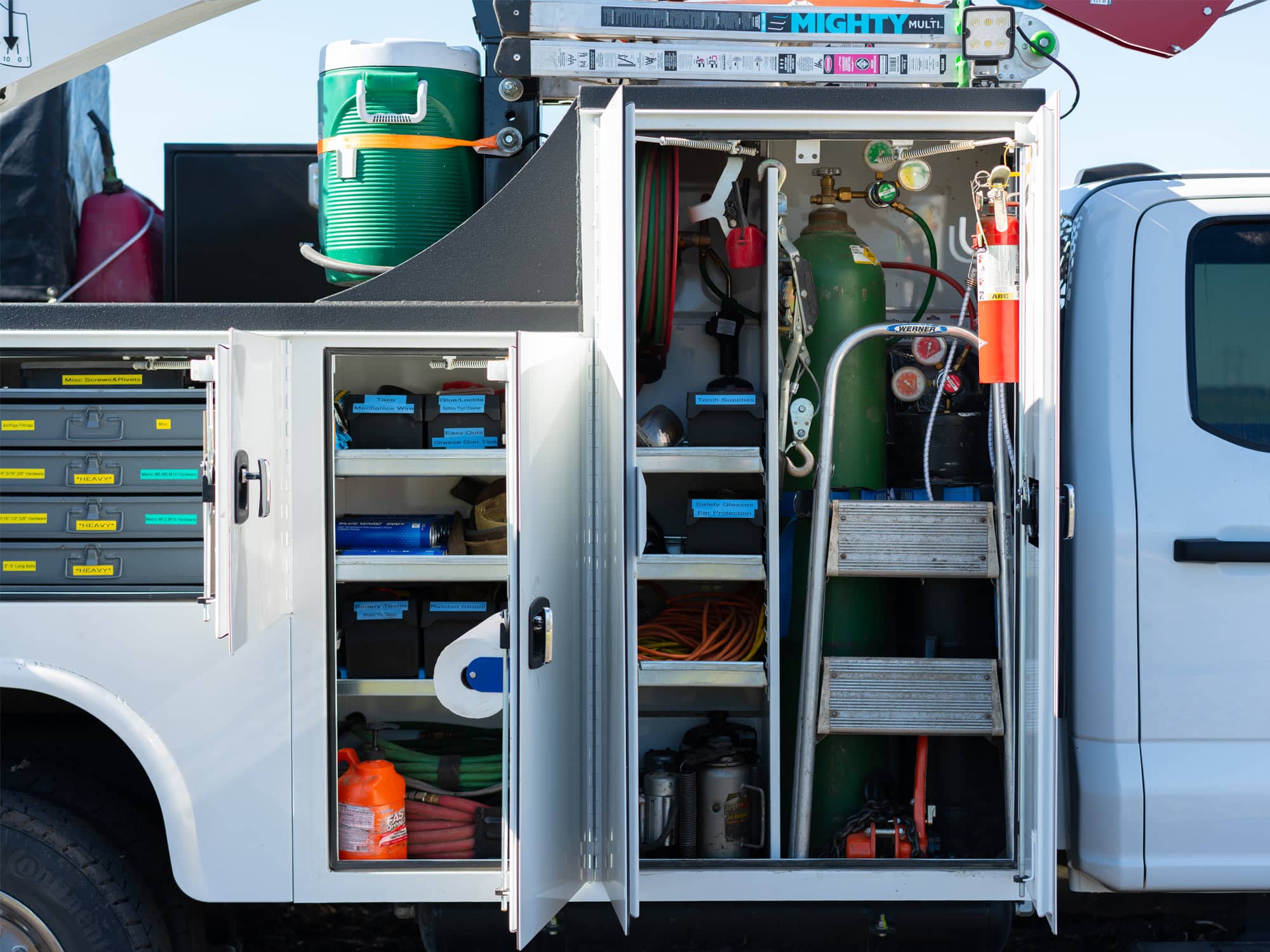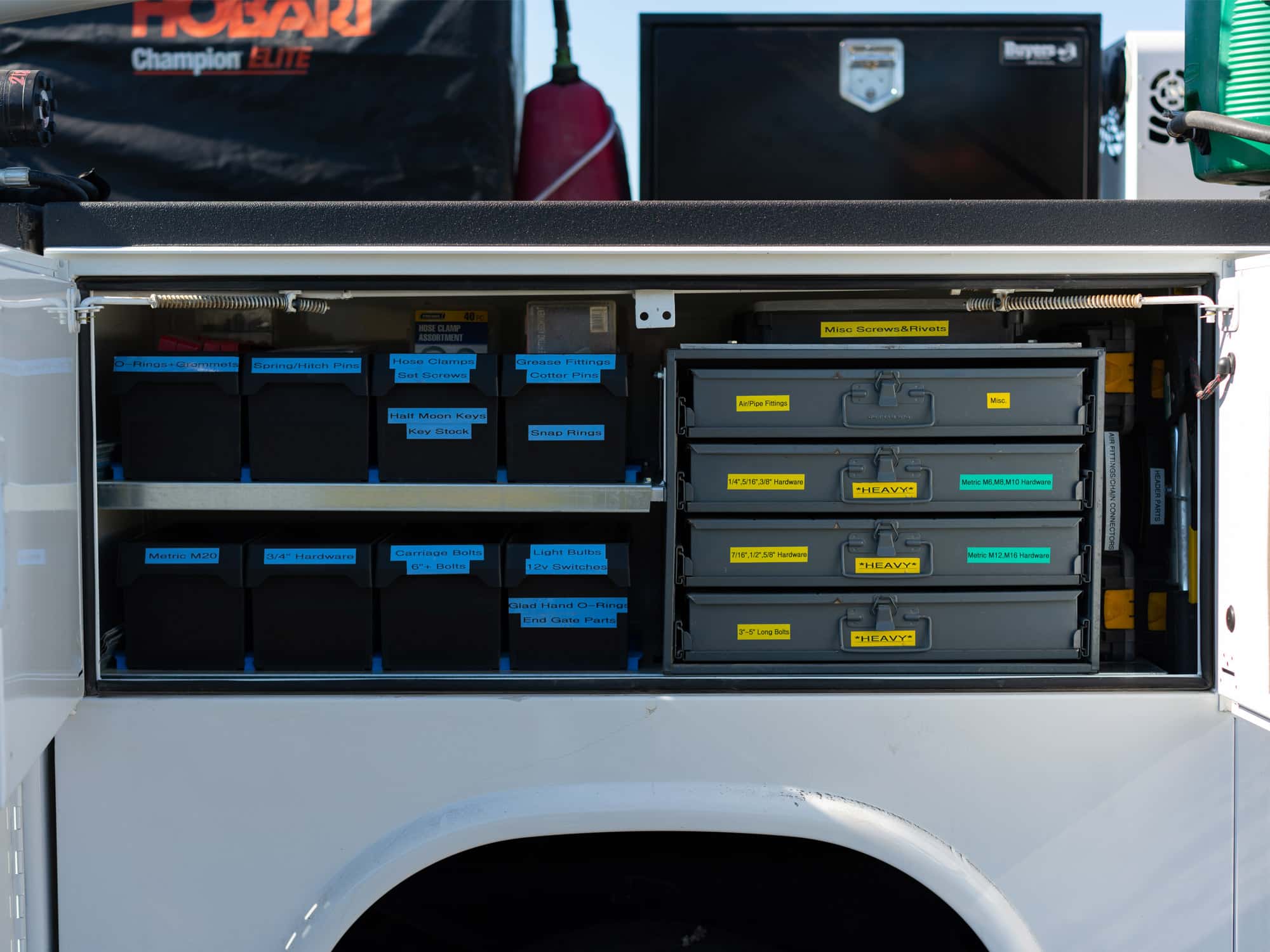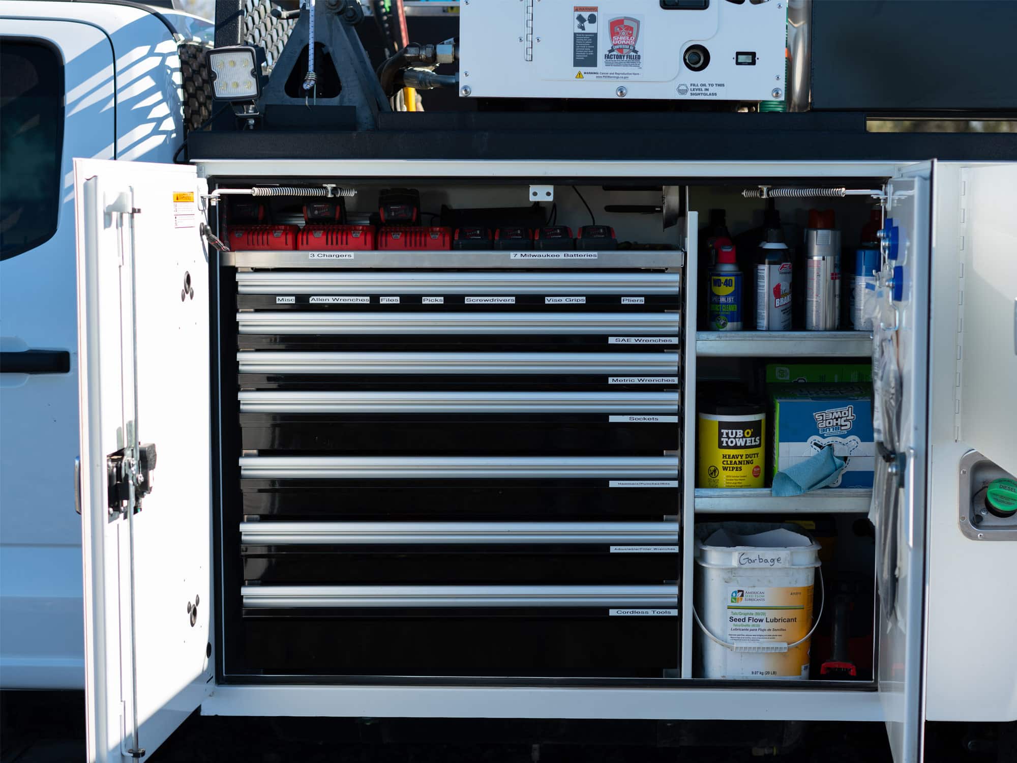 - Compartment lighting: Brightens tool and supply storage areas
