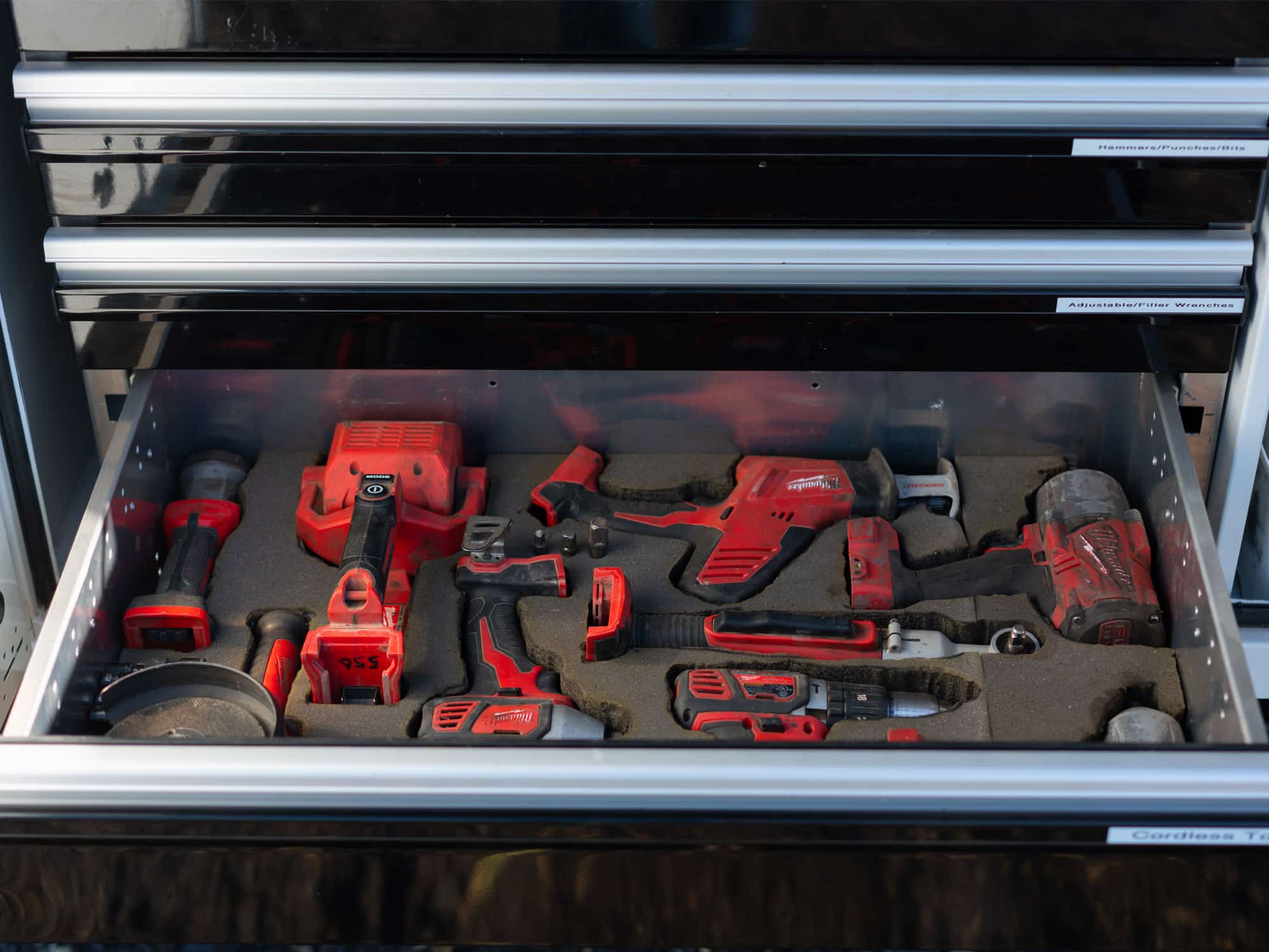 - Drawer system: Organizes hand and power tools