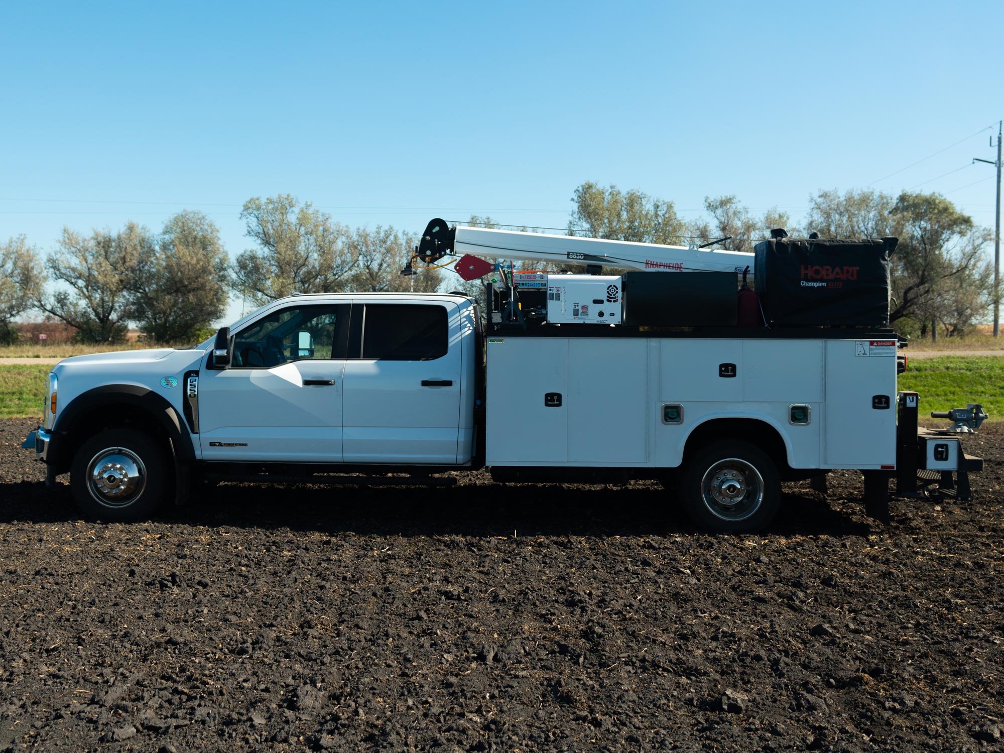 This farm truck is a mobile shop, built on a Ford F-550 chassis cab with a Knapheide steel service body and packed with features and options like a: