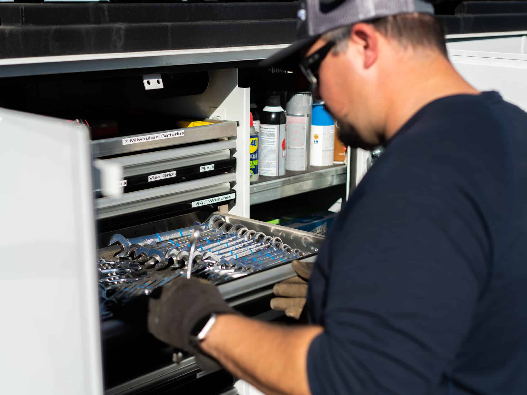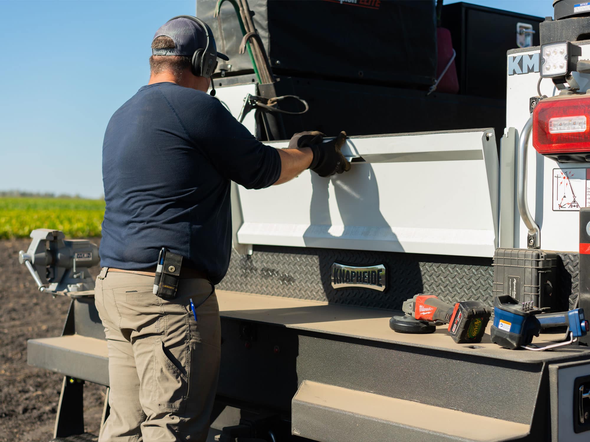 Farm Foreman Dustin Finney grabs tools needed for the job from a CTech Manufacturing drawer in his Knapheide KMT1 Mechanics Truck's compartment.