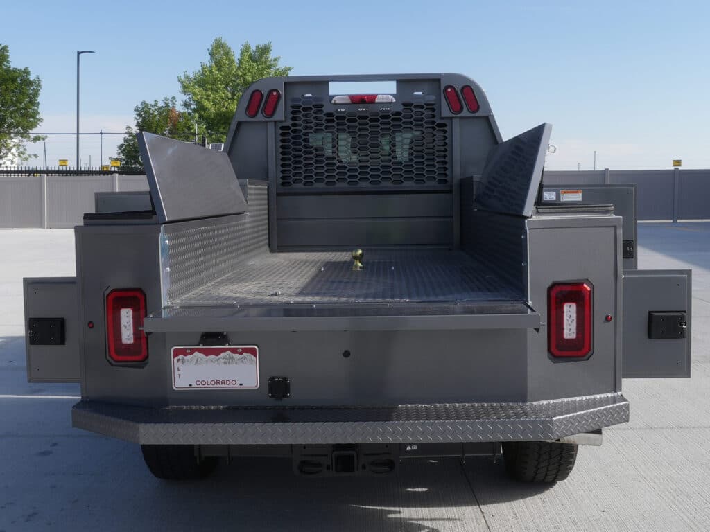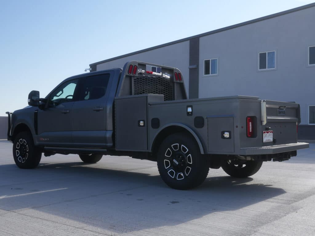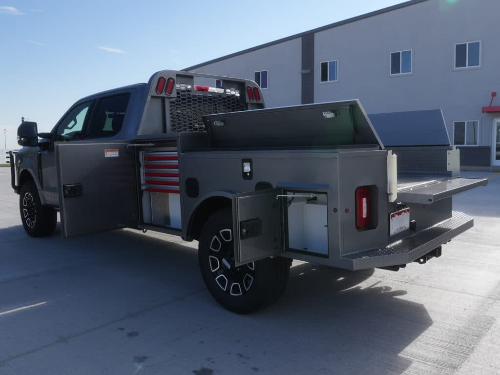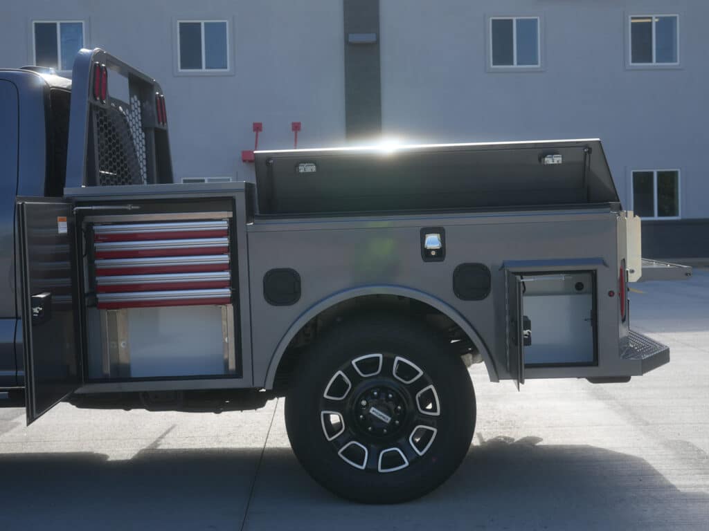 - Service truck bed style design with raised front, flip top, and rear underbody integrated compartments.