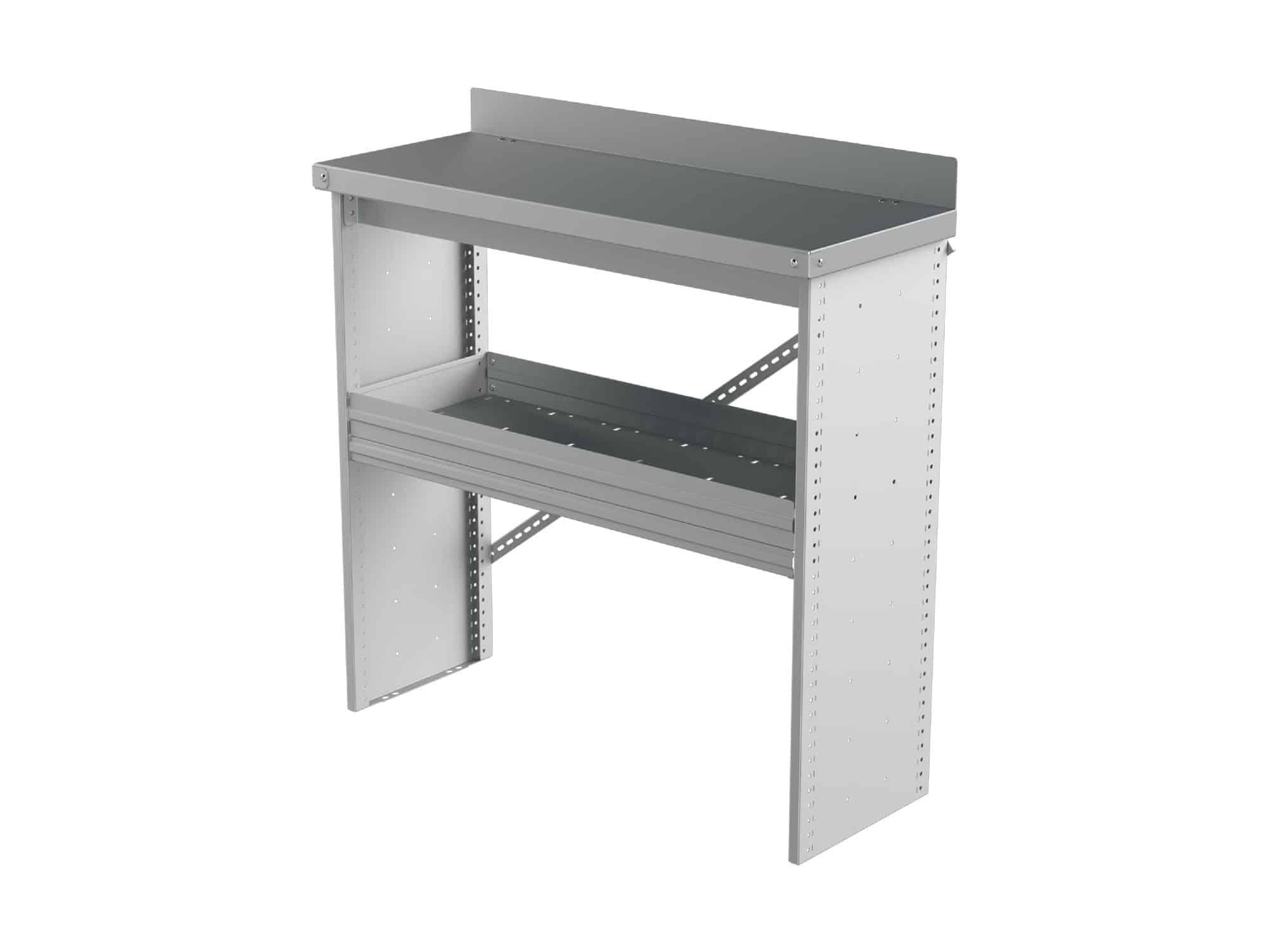 This flat, durable surface installed in the cargo area of a work van, provides field technicians with a reliable on-board workspace. It supports a wide range of tasks including measuring, cutting, drilling, assembling materials, inspecting, testing, maintaining or repairing items, restocking supplies, organizing tools and completing paperwork.