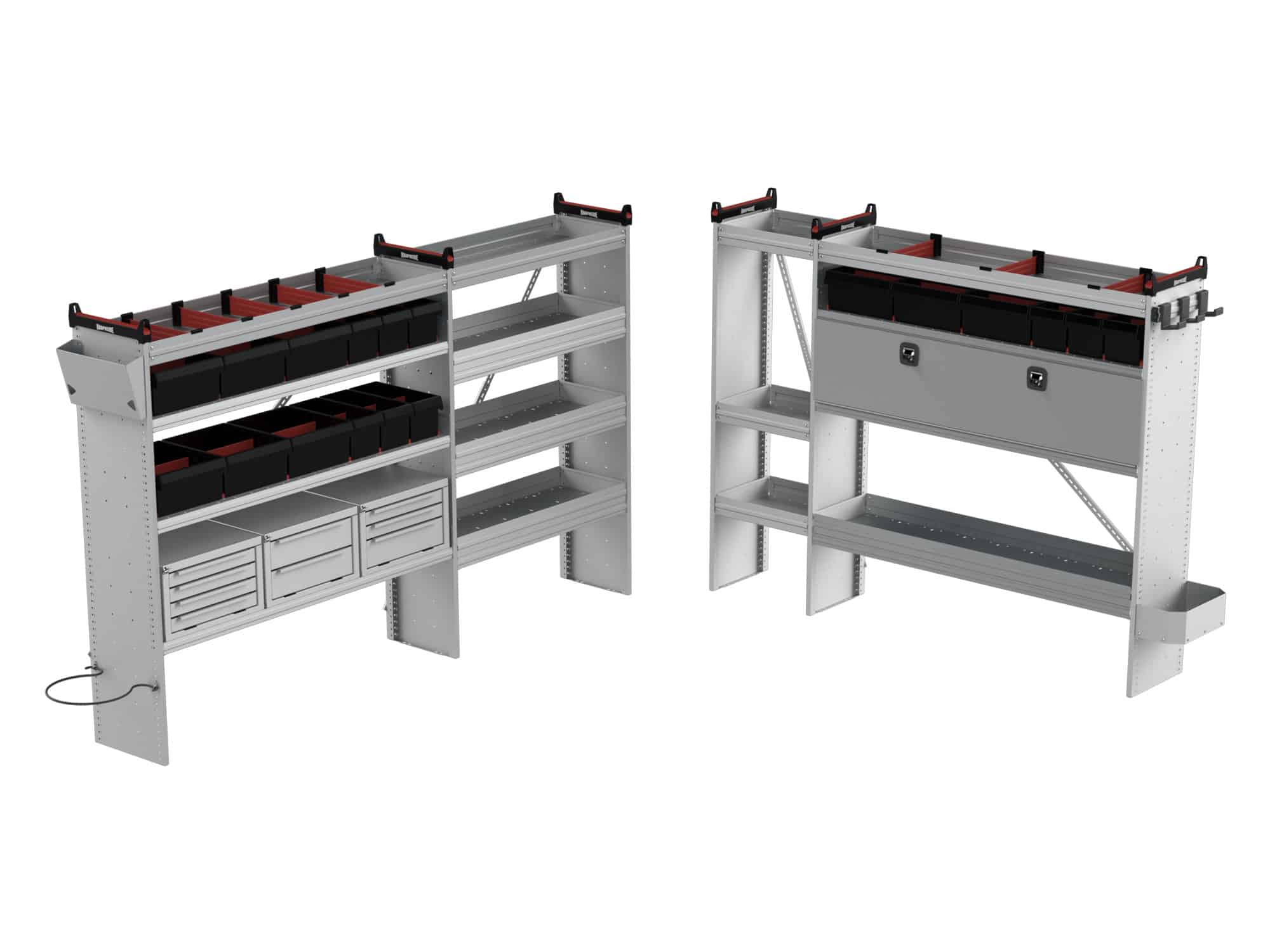 This upgraded version of the Knapheide fixed van shelving package BP6462-62 is designed to help plumbing contractors better store, organize, access, and secure the tools, equipment and materials they use on the job. This system is compatible with the van makes, models and configurations listed below and potentially others depending on their body length and roof height. A typical plumbing van setup may house cargo including, but not limited to, pipes, fittings, showers, tubs, sinks, fixtures, appliances, and other relevant parts and supplies.